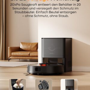 - Automatisches Absaugen: Dank der 3.5L Absaugstation entfällt das tägliche manuelle Entleeren des Staubbehälters über Wochen hinweg.