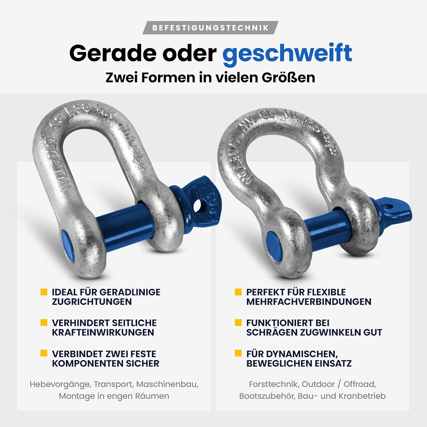 Die geschweifte Form des Schäkels ermöglicht die Aufnahme von Lasten aus verschiedenen Richtungen, ohne dass der Schäkel selbst unter Torsionsbelastung leidet. Dies macht ihn besonders vielseitig für Hebeanwendungen, bei denen der Anschlagpunkt nicht immer perfekt in der Zuglinie liegt. Dank des robusten Materials hält er unterschiedlichen mechanischen Belastungen sicher stand.