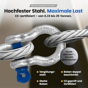 Die Angabe von 3,25 Tonnen beschreibt die maximale Tragfähigkeit (Working Load Limit), für die der Schäkel ausgelegt ist. Die hohe Belastbarkeit resultiert aus dem massiven, feuerverzinkten Stahl, der für eine robuste und langlebige Struktur sorgt. Aufgrund seiner hochwertigen Verarbeitung erreicht das Produkt eine sehr gute Kundenbewertung von 4,7 Sternen.