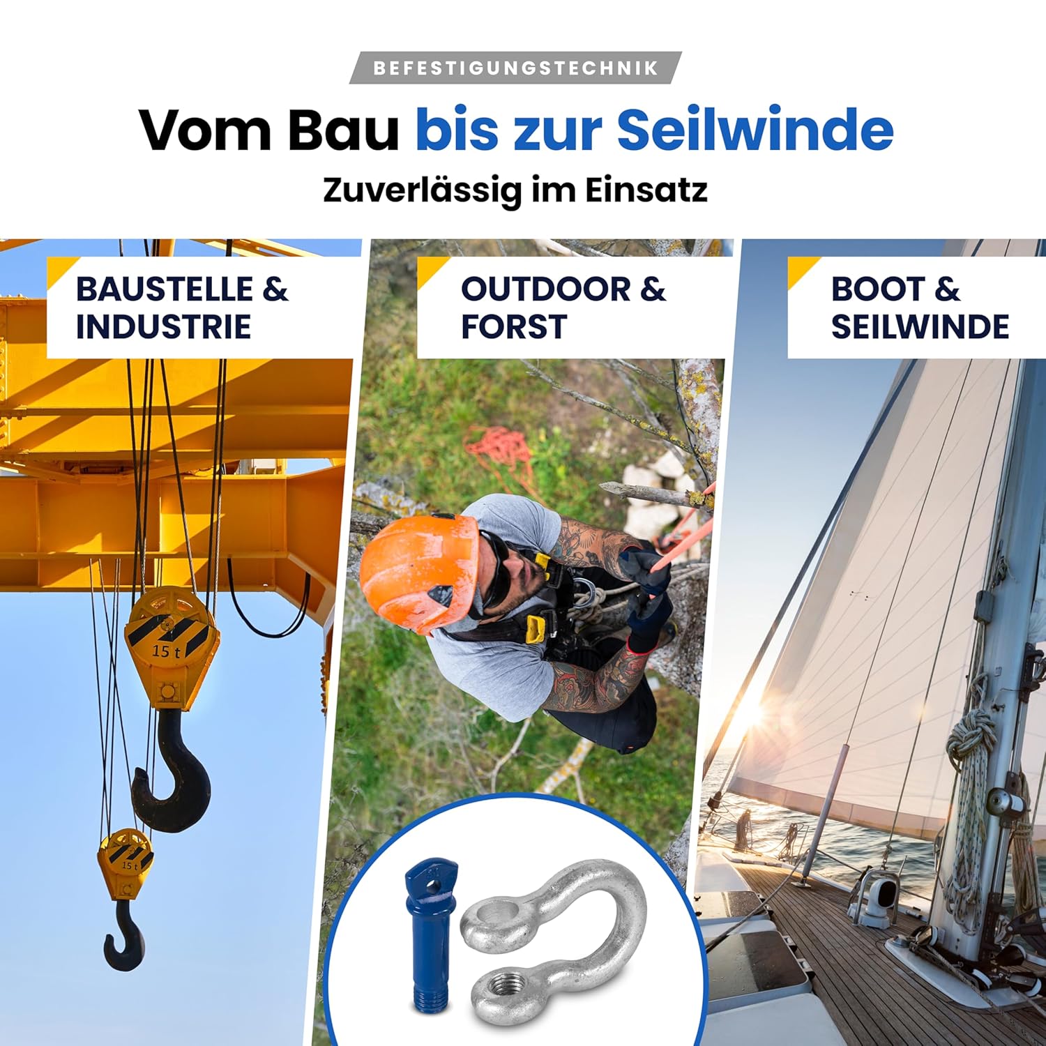 Die Einsatzgebiete für diesen Schäkel sind vielfältig. Metallbauer setzen ihn primär zur Sicherung von Stahlträgern oder bei der Montage schwerer Maschinenkomponenten ein. Im Forstbereich dient er als zuverlässiges Bindeglied für Anschlagketten beim Rücken von Holz. Auch im Offroad-Bereich oder im privaten DIY-Sektor, etwa beim Bau schwerer Konstruktionen oder dem Abspannen von massiven Holzstrukturen, bietet er die notwendige Stabilität.