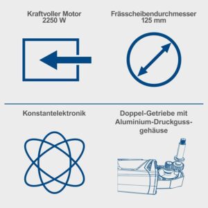 - • 2250 W Leistung für müheloses Fräsen in hartem Beton und Ziegelmauerwerk.
