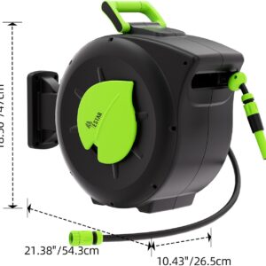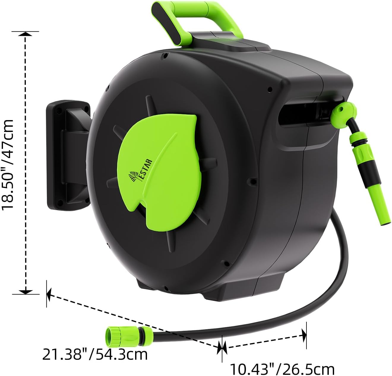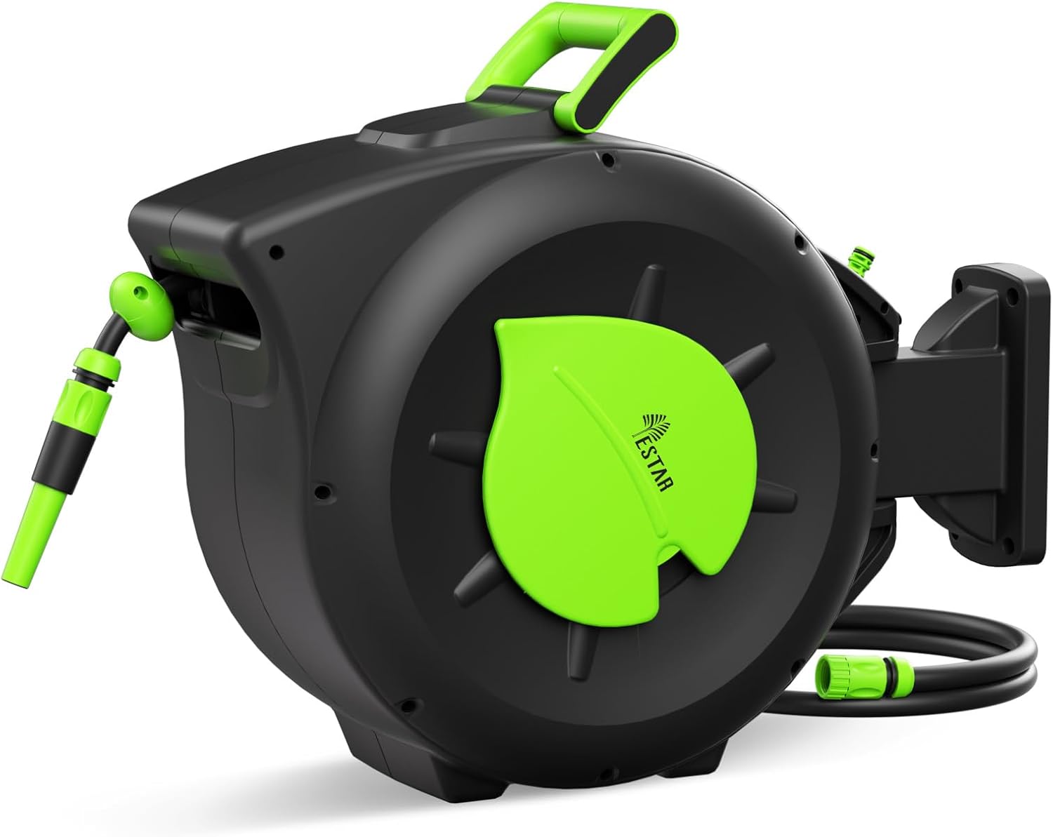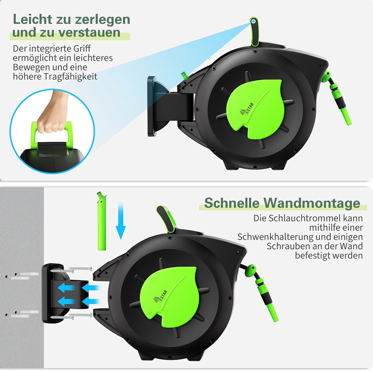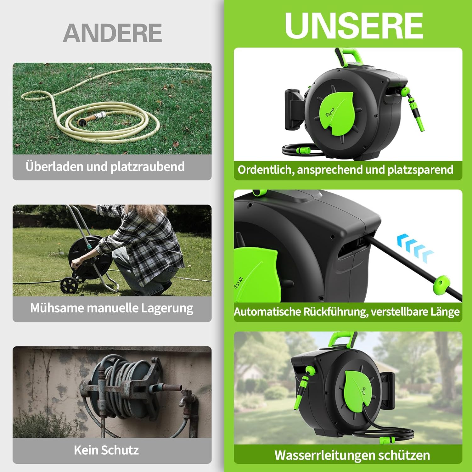 - Selbsttätiger Einzug: Dank der robusten Federkraft-Automatik rollt sich der Schlauch nach einem kurzen Ruck definiert und materialschonend wieder auf – manuelle Kurbelarbeit entfällt komplett.
