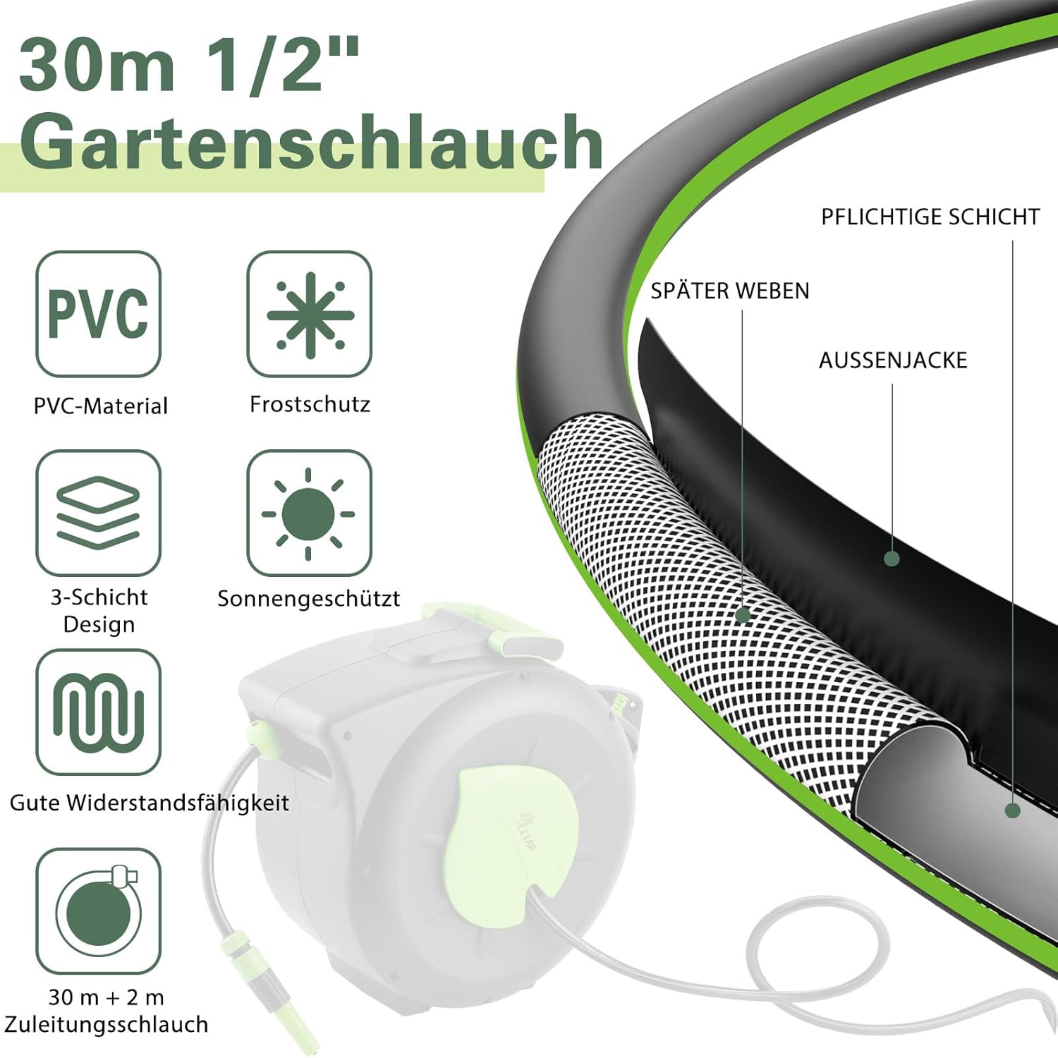Diese 30m+2m Schlauchtrommel mit Wandmontage ist die optimale Lösung für Gartenbesitzer, Hausmeister und ambitionierte Heimwerker, die Wert auf Ordnung und Effizienz bei der Bewässerung legen. Das System ermöglicht ein müheloses, knickfreies Arbeiten durch eine integrierte Aufroll-Automatik, die den Schlauch nach getaner Arbeit sauber verstaut. Sie ist damit das ideale Werkzeug für alle, die große Flächen effizient bewässern oder Fahrzeuge professionell reinigen möchten.