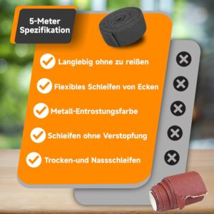 - Lagerung: Bewahre die Rolle an einem trockenen Ort auf, um die Bindemittel des Schleifkorns vor Feuchtigkeit zu schützen.