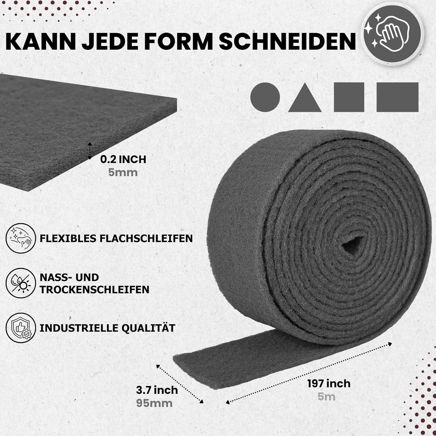 Im Paket enthalten ist eine Schleifvlies-Rolle mit den Maßen 5 m Länge und 95 mm Breite in der Körnung 1000 (grau). Die Rolle lässt sich flexibel auf die von Ihnen benötigte Länge zuschneiden, sodass sie optimal an Ihre jeweiligen Schleifbedürfnisse angepasst werden kann.