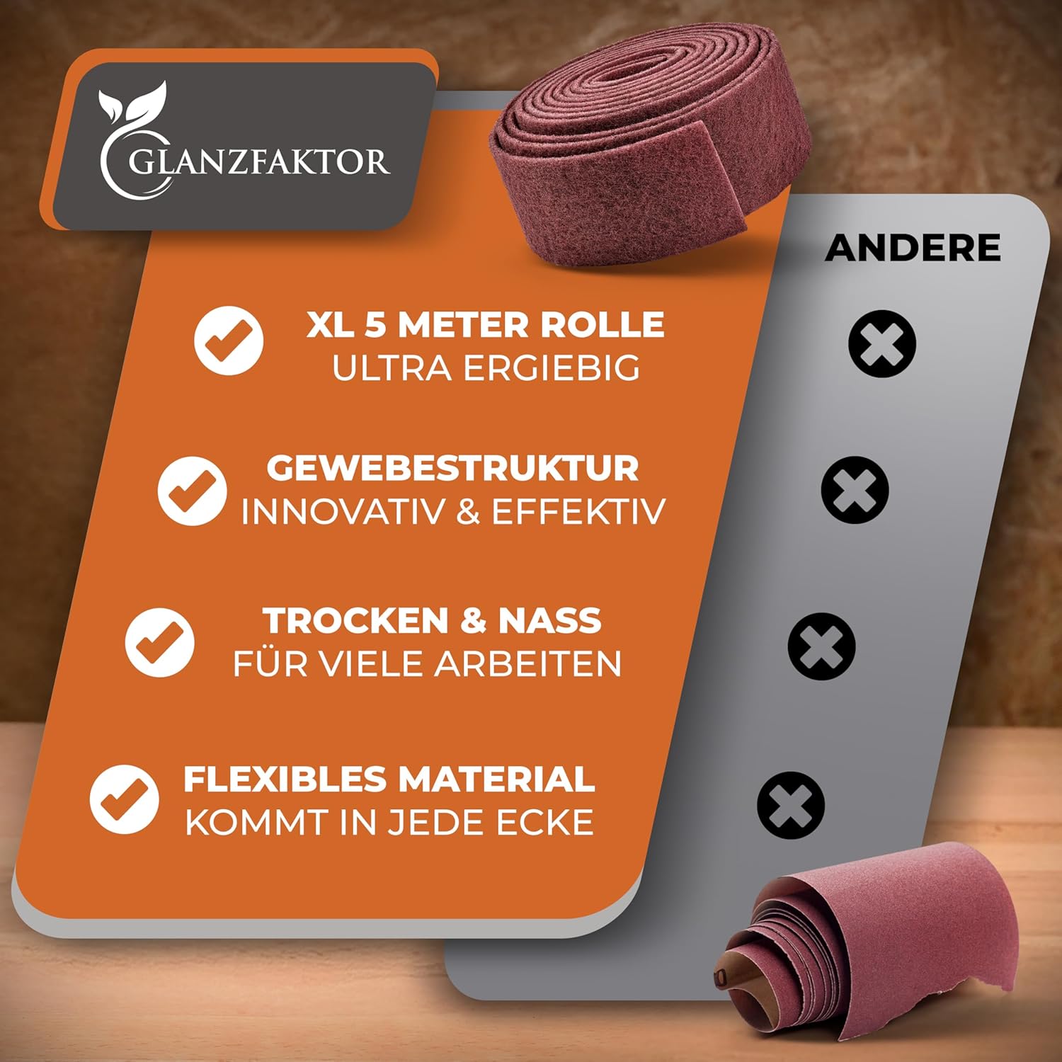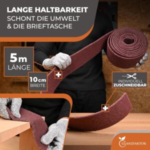 Das Schleifvlies ist besonders robust gefertigt und übertrifft herkömmliche Alternativen in Sachen Haltbarkeit deutlich. Durch die Verwendung von hochwertigem Aluminiumoxid behält es seine Schleifeigenschaften über einen längeren Zeitraum bei. Dies macht es zu einer effizienten Wahl für regelmäßige Schleifarbeiten.