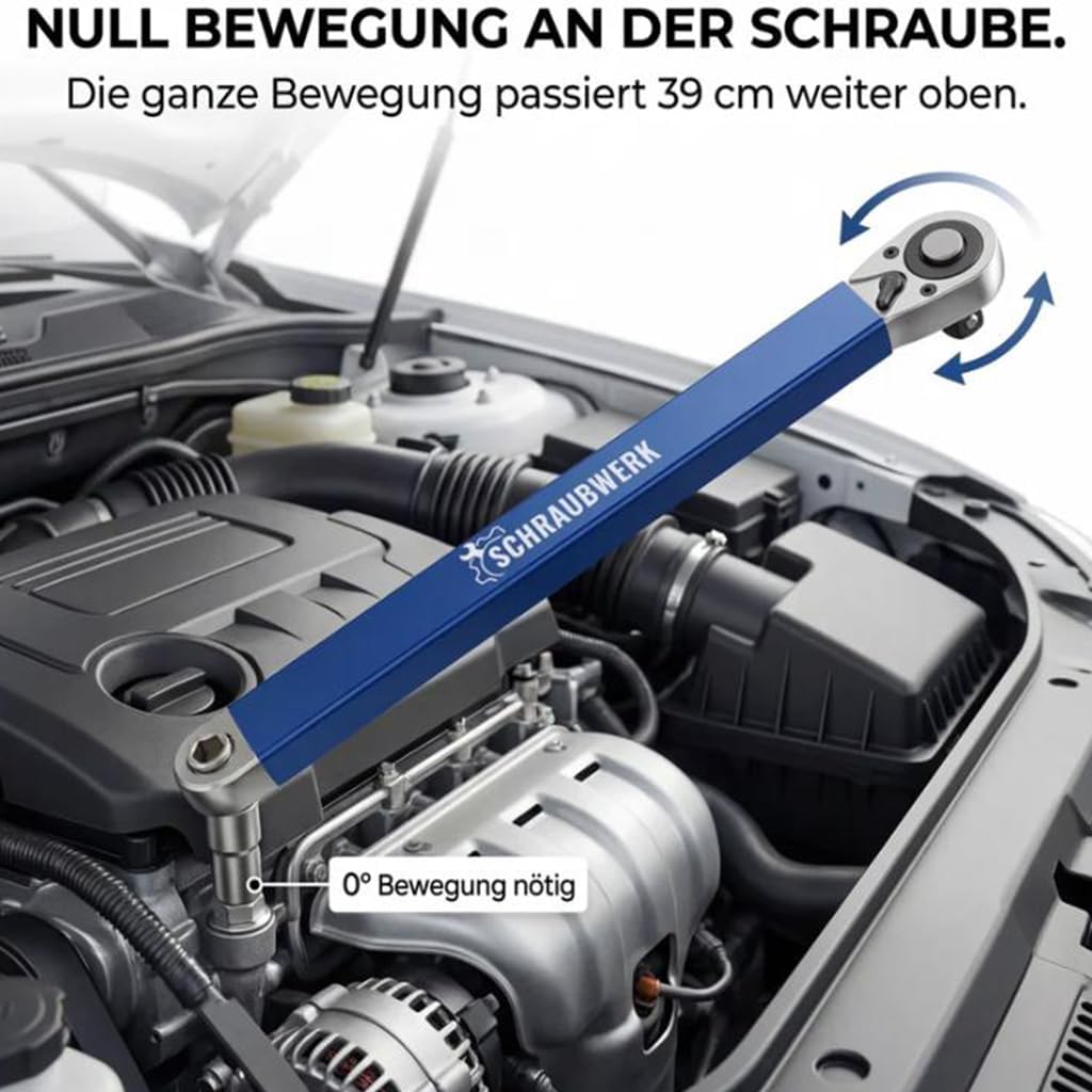 Aus unserer Erfahrung in der Werkstatt ist die 16mm flache Bauhöhe der entscheidende Faktor. Sie erlaubt es, in Ritzen zu arbeiten, in die nicht einmal die Hand passt, geschweige denn ein konventioneller Ratschenkopf. Die Handhabung ist intuitiv: Am Ende des 39 cm langen Schafts setzt du deine Standard-Knarre an. Dein Kraftaufwand wird direkt übersetzt, während deine Finger sicher vor scharfen Motorkanten und heißen Anbauteilen geschützt bleiben.