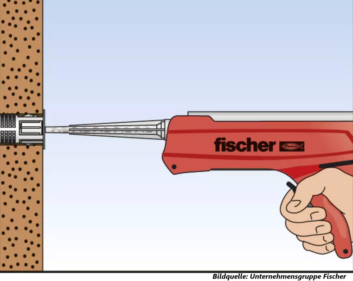 Das Schwerlastbefestigungs-Set M10x165mm setzt auf den bewährten fischer FIS VL 300 T 2K-Injektionsmörtel. Das Funktionsprinzip ist simpel und effektiv: Harz und Härter sind in getrennten Kammern gelagert. Erst beim Auspressen durch den Statikmischer vermischen sie sich, werden aktiviert und injizieren den Mörtel blasenfrei vom Bohrlochgrund aus nach außen.