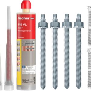 Das Set beinhaltet eine 300ml-Kartusche des Fischer Montagemörtels FIS VL 300 T sowie zwei zugehörige Statikmischer. Zudem umfasst der Lieferumfang vier M10-Gewindestangen inklusive der passenden Siebhülsen (16/85mm) sowie eine Zylinderbürste zur gründlichen Reinigung des Bohrlochs. Damit erhalten Sie ein Komplettpaket für die fachgerechte Montage.
