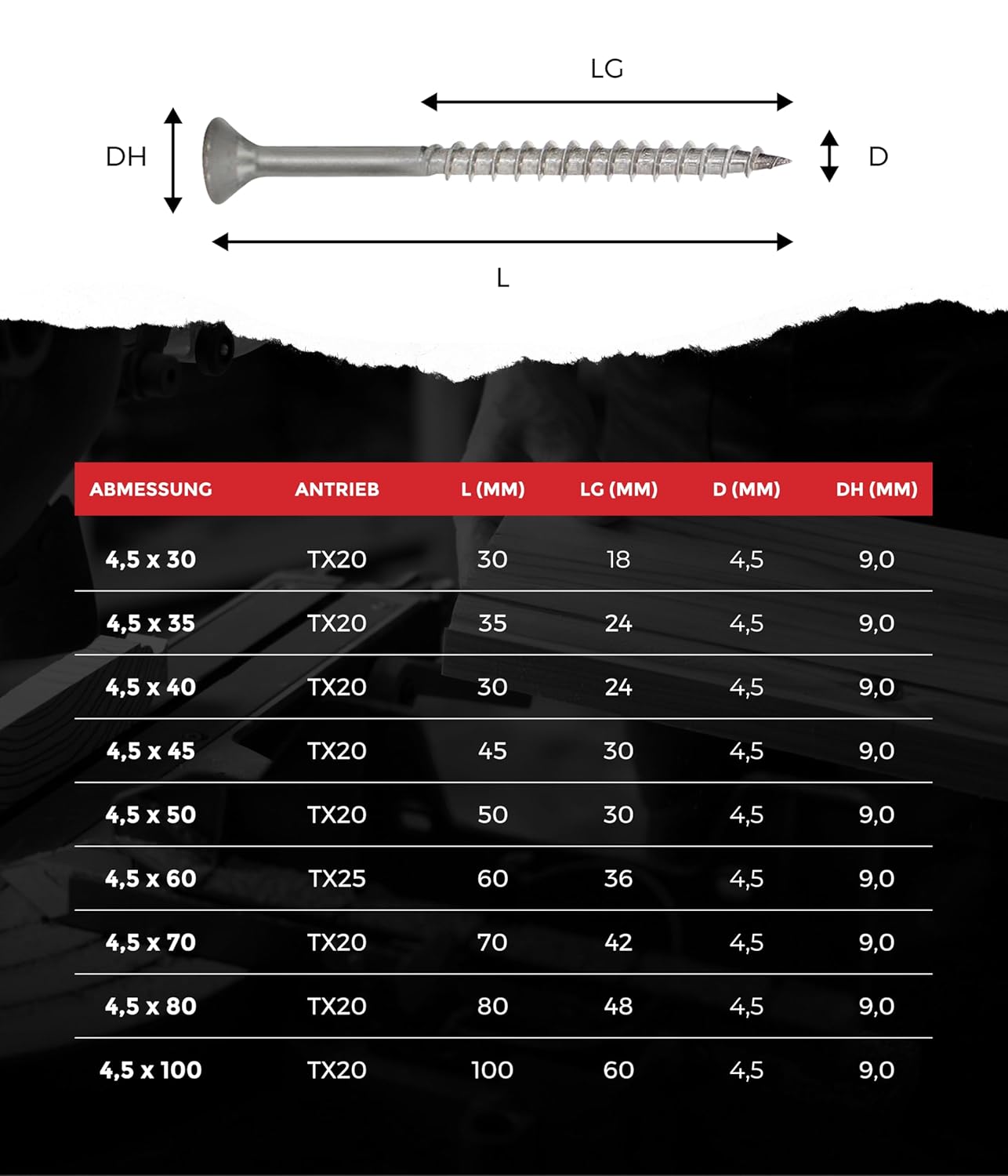 Diese 4,5×60 mm Schraube ist der „Mid-Size-Allrounder“ in der Werkstatt. Ich persönlich setze sie bevorzugt für den Unterkonstruktionsbau von Terrassen ein, bei denen es auf den korrosionsbeständigen A2-Edelstahl ankommt. Auch beim Bau von Gartenmöbeln oder im Innenausbau beim Verschrauben von Span- oder Profilholzplatten glänzt sie durch ihre Geometrie.