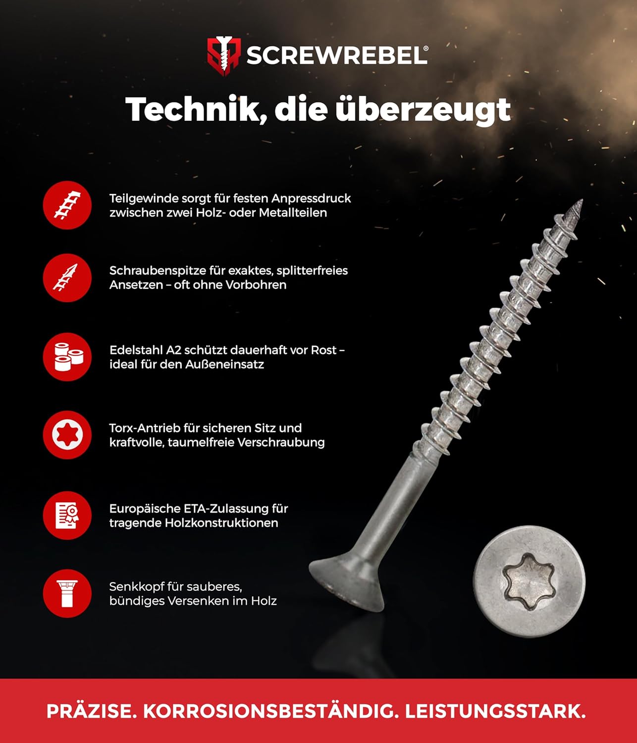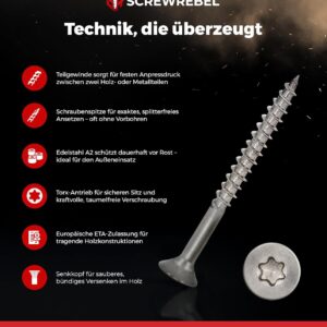 ![SCREW REBEL® Spanplattenschrauben 4x25 mm [100 Stück] – Edelstahl A2 rostfrei mit Teilgewinde & Senkkopf – TX20 Antrieb – Holzschrauben mit ETA-Zulassung – Bild 3](https://werkking.de/wp-content/uploads/2026/04/81YGpTrLOjL._SL1500_-1.jpg)
