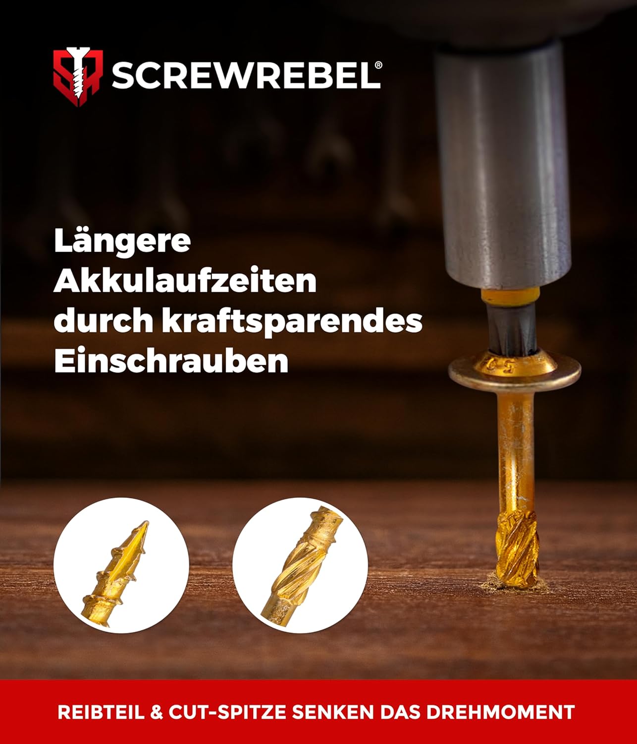 - Kraftersparnis und längere Akkulaufzeit: Reibteil, Cut-Spitze und Wachsbeschichtung reduzieren das benötigte Drehmoment erheblich – du arbeitest schneller und schonst deinen Akkuschrauber
