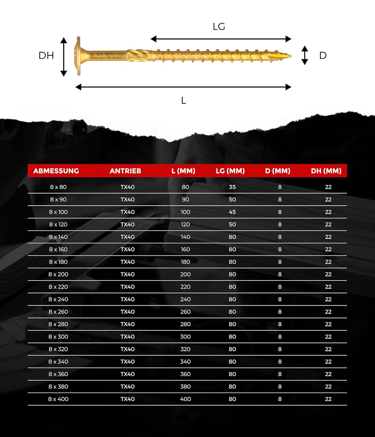 Diese Schrauben sind speziell für den konstruktiven Holzbau ausgelegt. Du kannst sie ideal für den Bau von Carports, Dachstühlen, Gartenhäusern oder bei der Aufsparrendämmung einsetzen. Sie funktionieren exzellent in Kanthölzern, Leimholz oder massiven Konstruktionsvollholz (KVH).