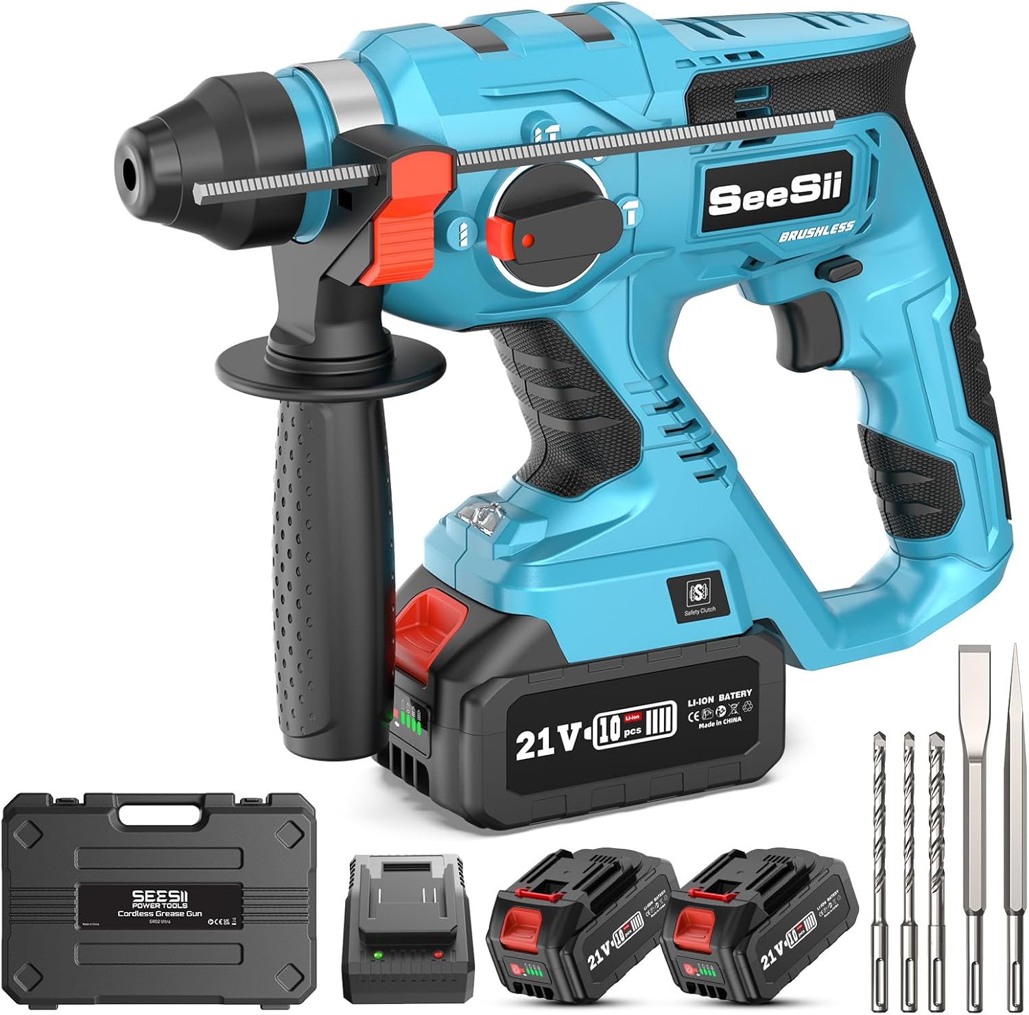 Seesii 4-IN-1 Akku Bohrhammer Set: Schlagbohrmaschine 2.1 J, Bürstenloser Motor, Anti-Vibrationsgriff, LED-Licht, mit 2 * 4.0Ah Akkus & Ladegerät, 3 Bohrer SDS-Plus & 2 Meißel im Handwerkerkoffer Seesii 4-IN-1 Akku Bohrhammer Set: Schlagbohrmaschine 2.1 J, Bürstenloser Motor, Anti-Vibrationsgriff, LED-Licht, mit 2 * 4.0Ah Akkus & Ladegerät, 3 Bohrer SDS-Plus & 2 Meißel im Handwerkerkoffer