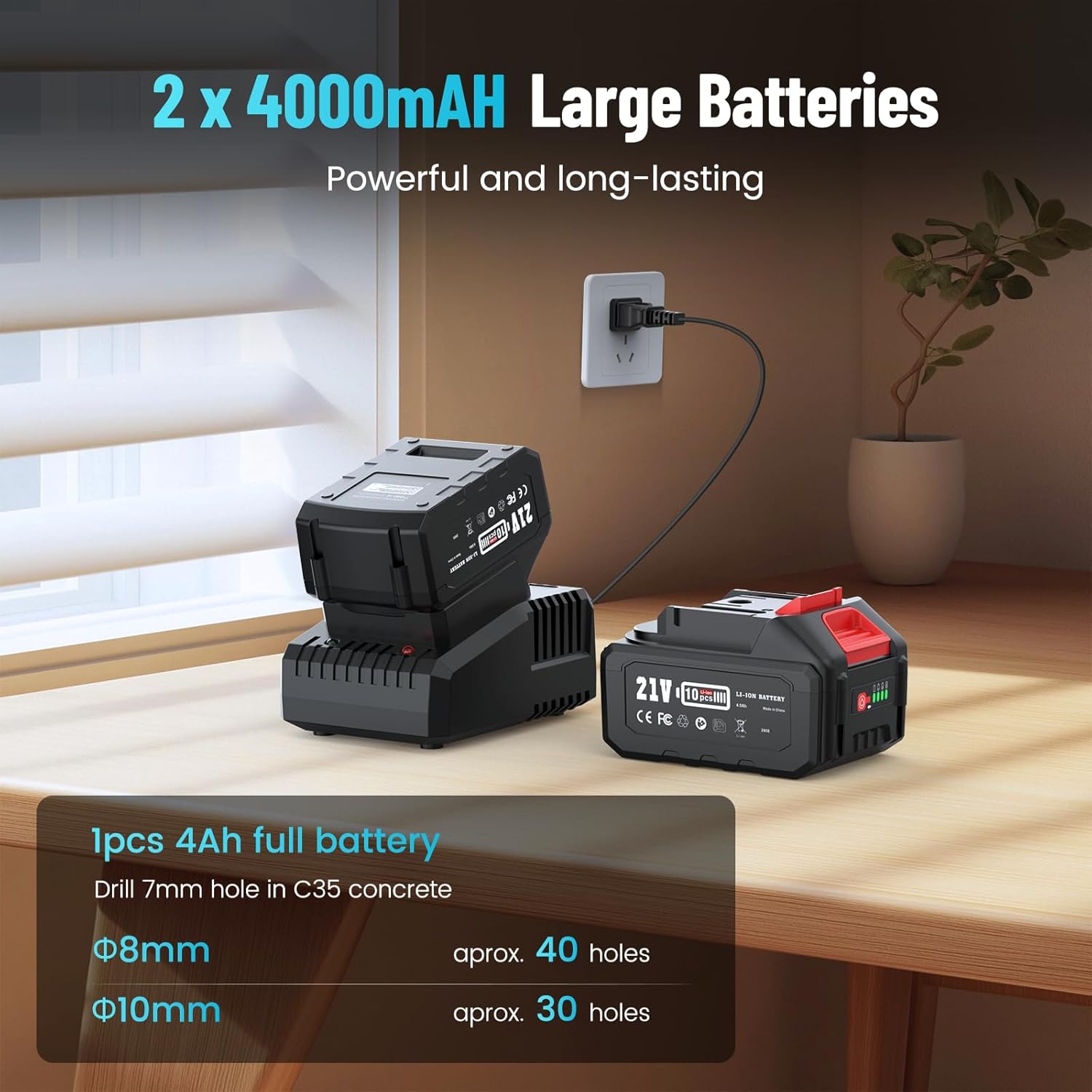 Die zwei mitgelieferten 21V 4,0Ah Akkus ermöglichen flexibles Arbeiten: Während ein Akku im Einsatz ist, lädt der zweite am Schnellladegerät. Unser Team hat getestet, dass ein vollgeladener Akke für etwa 60-80 Löcher (10mm Durchmesser, 6cm Tiefe) in mittelharten Beton reicht – ausreichend für typische Renovierungsarbeiten. Der Anti-Vibrationsgriff und die Sicherheitskupplung schützen bei Blockierungen und reduzieren die Belastung für Arme und Handgelenke bei längeren Arbeiten.