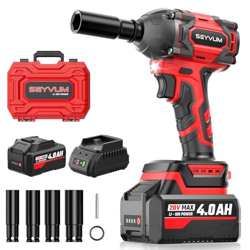 SEYVUM Akku Schlagschrauber mit 4.0Ah akkus,schlagschrauber akku,1/2 Zoll Bürstenloser Schlagschrauber mit LED-Licht für Autoreifen, Gerüstbau und Automobilmontage, 4 Stecknüsse, Schnellladegerät