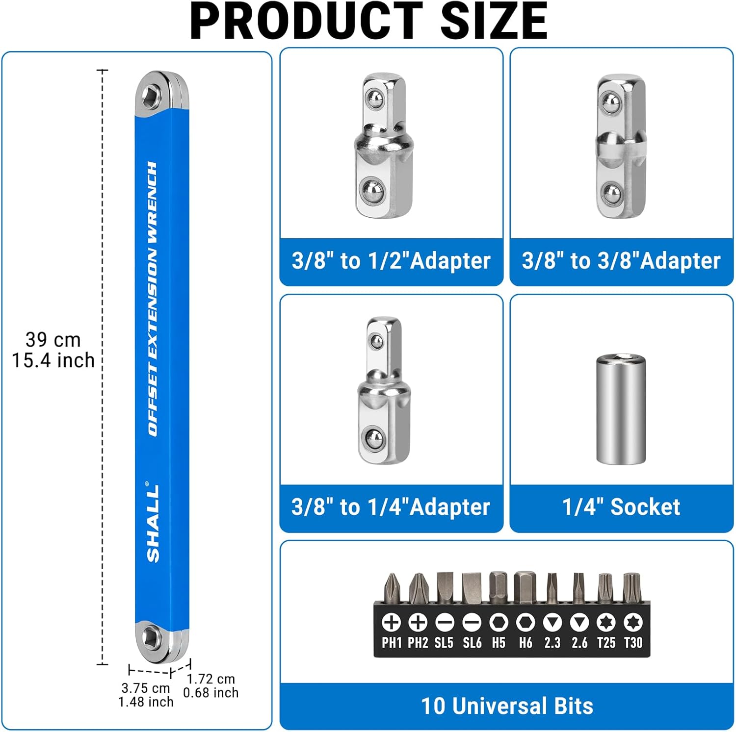 Shall Versetzter Verlängerungsschlüssel, 15,4 Zoll (39 cm), mit 1/2 Zoll, 1/4 Zoll und 3/8 Zoll Vierkantantriebsadaptern und 10 Universal-BitsShall Versetzter Verlängerungsschlüssel, 15,4 Zoll (39 cm), mit 1/2 Zoll, 1/4 Zoll und 3/8 Zoll Vierkantantriebsadaptern und 10 Universal-Bits
