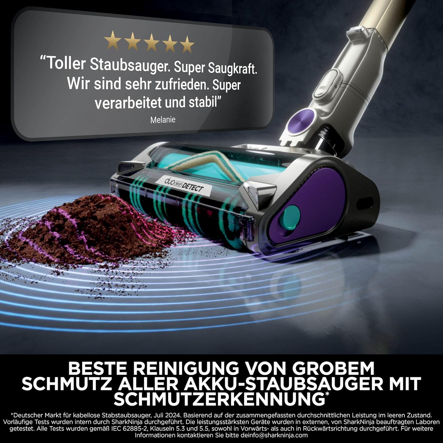 Der Shark PowerDetect Clean & Empty Akku-Staubsauger IP3251EUT ist ein leistungsstarker kabelloser Staubsauger mit automatischer Absaugstation, intelligenter Technologie und starker Saugkraft. Seine lange Akku-Laufzeit ist ideal für große Flächen. Starke Bürsten: Die DuoClean Detect-Technologie mit zwei Bürstenrollen und mehreren Sensoren passt sich automatisch an den Bodentyp an. DirectionDetect ermöglicht effizientes Saugen in beide Richtungen, während Reverse Clean die Bürstenrolle beim Sauge