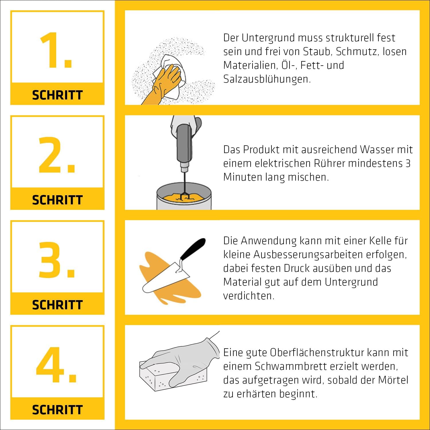 - Verarbeitung: Den Mörtel idealerweise mit einer Glättkelle oder einem Spachtel einpressen.