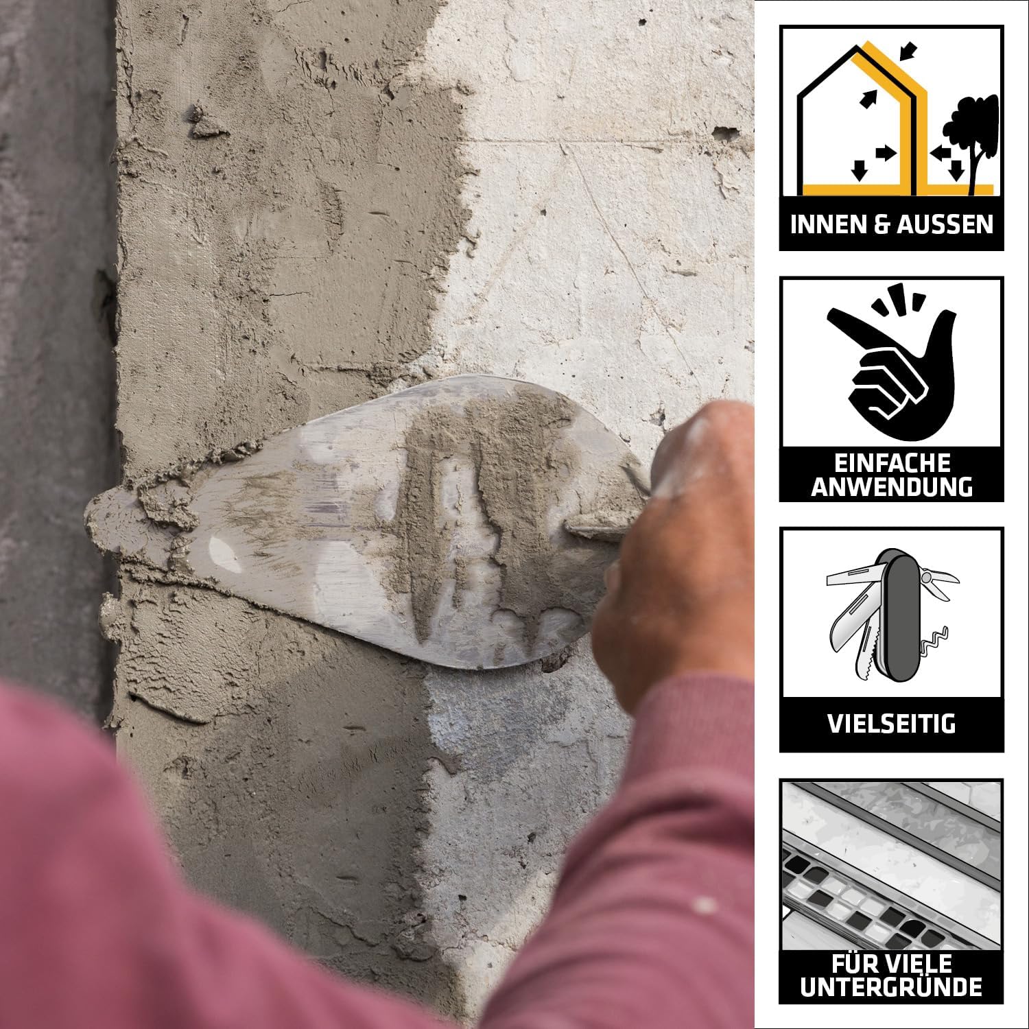 - Exzellente Haftung: Verbindet sich kraftschlüssig mit dem Untergrund und sorgt für eine dauerhafte Reparatur von Abplatzungen.