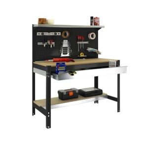 Simon Rack Arbeitstisch, Werkbank 1445x910x610 mm, 400 kg Belastbarkeit, 1 Schublade mit Teleskopschienen, Perforierte Rückwand, Große Arbeitsfläche, Holz-Arbeitsplatte, Anthrazit/Holz – Simonwork