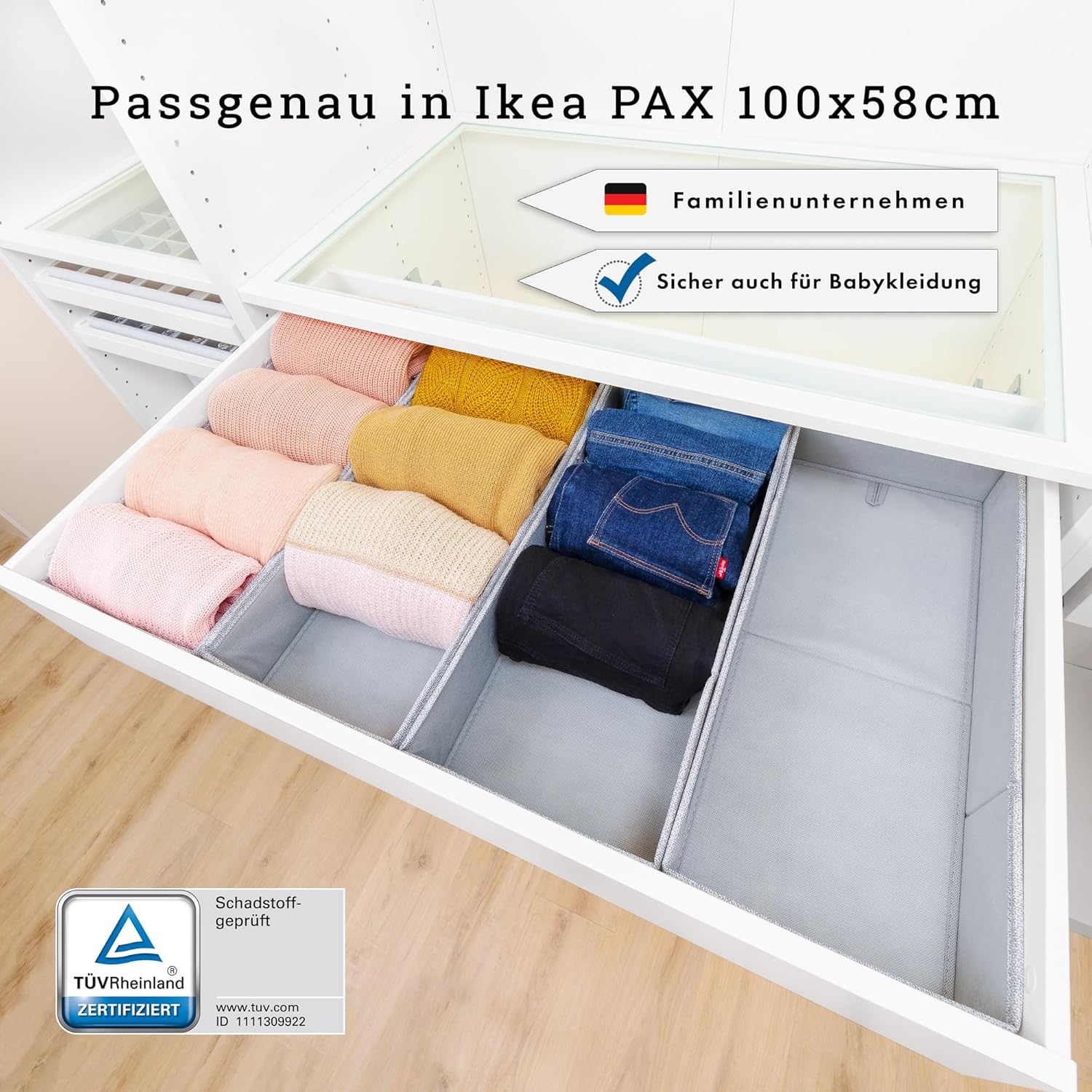 Ja, das 4er Set ist speziell dafür entwickelt, passgenau in die IKEA PAX Schubladen der Größe 100×58 cm zu passen. Damit nutzen Sie den verfügbaren Stauraum in Ihrem Schrank optimal aus.