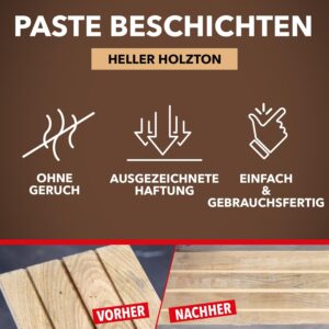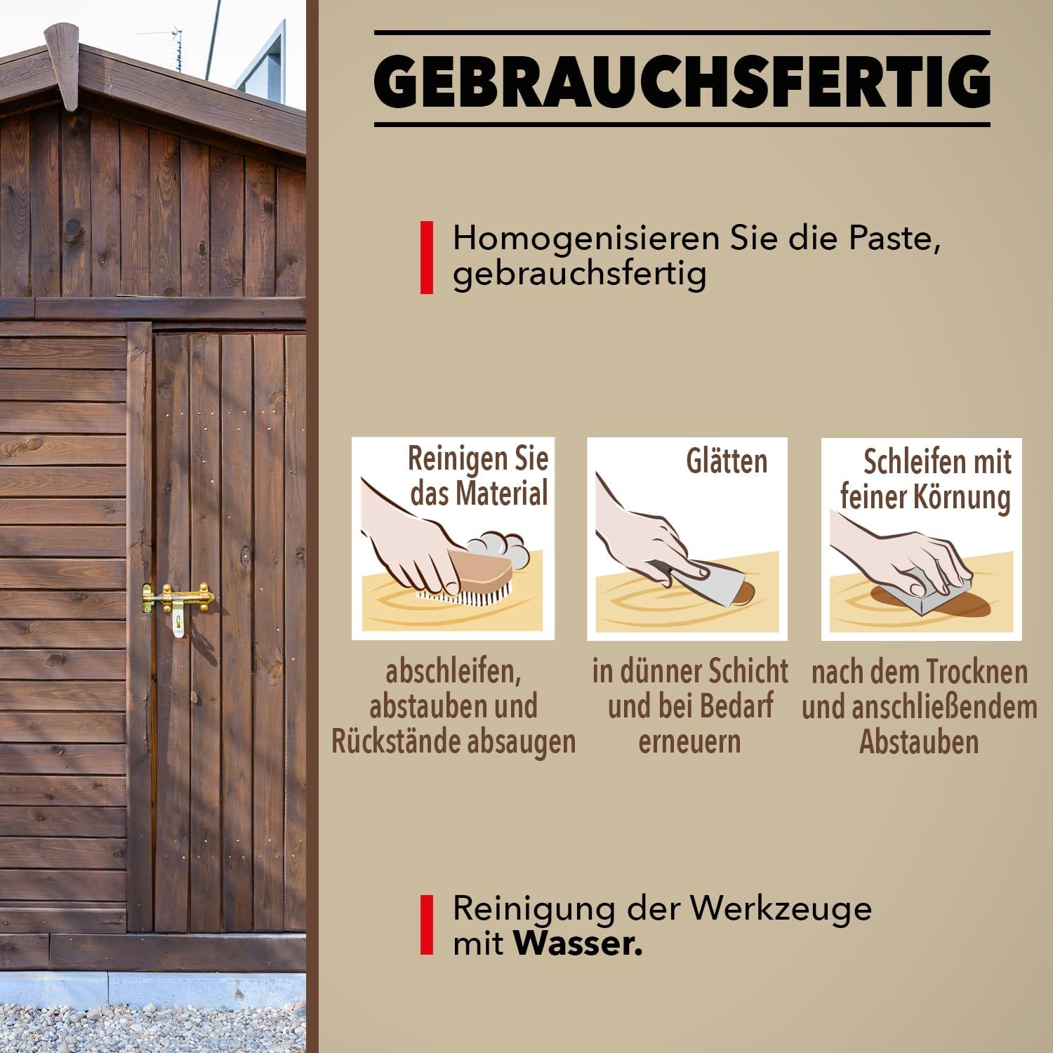 - Optimale Oberflächenvorbereitung: Nach der Aushärtung ist die Stelle problemlos schleifbar und lässt sich mit Holzbeize in der Farbe perfekt anpassen.