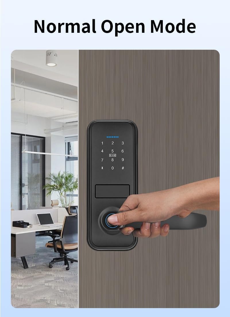 Aus unserer Erfahrung in der Montagepraxis ist die Einrichtung der App-Steuerung intuitiv gestaltet. Die Verwaltung von bis zu 300 Nutzern (Fingerabdruck, Passwort oder Karte) ermöglicht eine extrem detaillierte Rechtevergabe. Besonders überzeugt hat uns die Möglichkeit, einen „Normal Open Mode“ zu aktivieren, bei dem die Tür zeitweise ohne Verifizierung geöffnet werden kann – ein praktisches Feature beim Beladen von Werkzeug oder dem Transport von Baumaterialien.