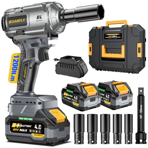 SoarFly Akku Schlagschrauber, 1200 Nm (900 FT-LBS), 1/2-Zoll-Schlagschrauber mit hohem Drehmoment, bürstenloser Motor, 2x4.0Ah Akku, 3 Geschwindigkeitsstufen, für Reifenwechsel und Kfz-Wartung