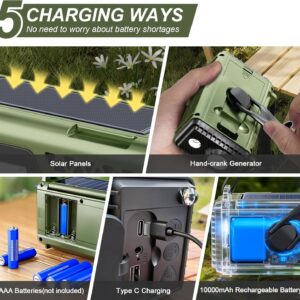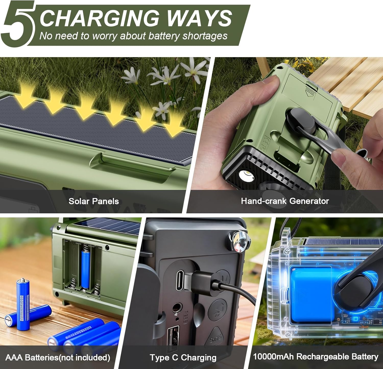 - 5 Stromquellen garantieren durchgehende Einsatzbereitschaft: Handkurbel, Solarpanel, AAA-Batterien, USB-C-Ladung und integrierter Lithium-Akku – dein Gerät läuft immer, auch wenn keine Steckdose verfügbar ist