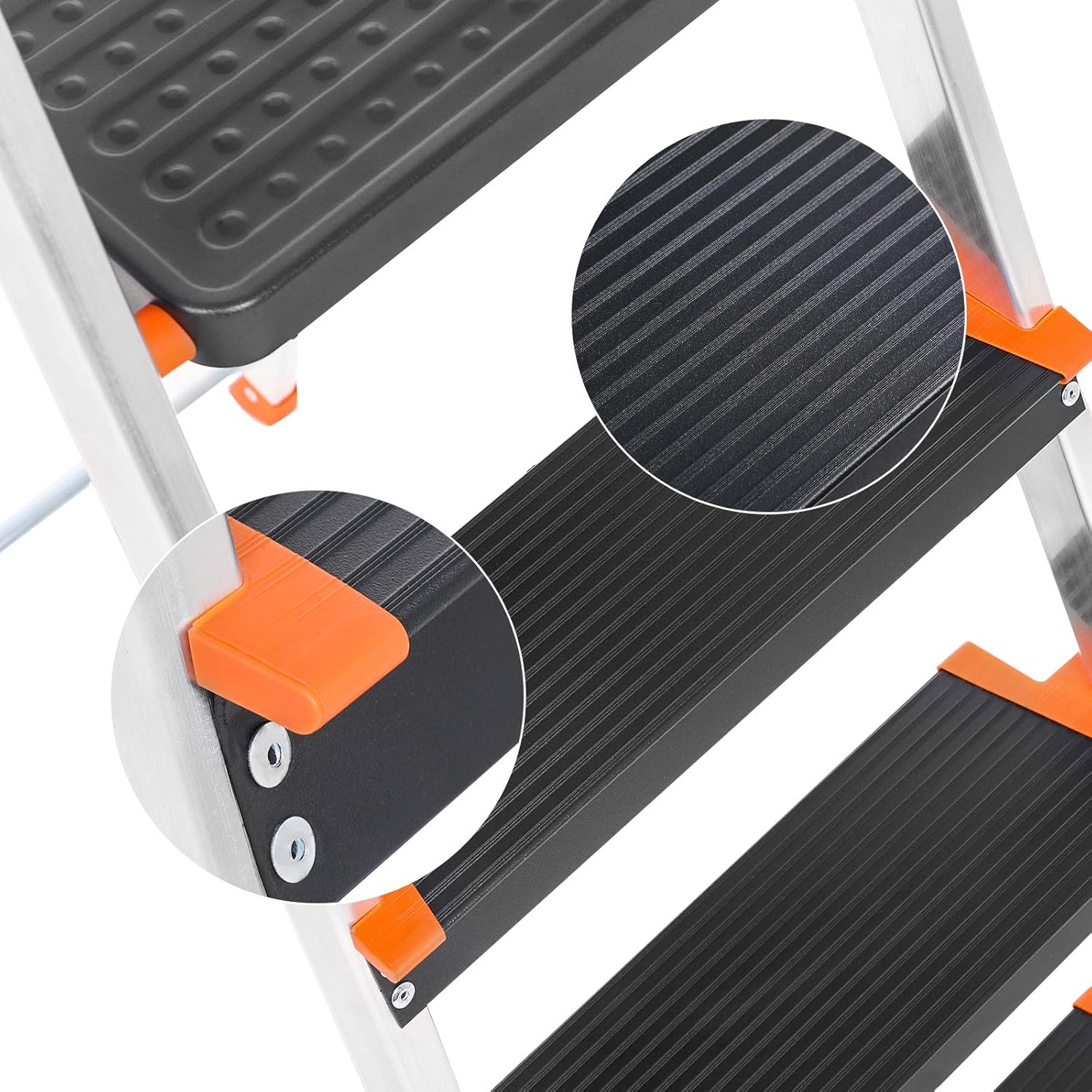 Sicherheit steht bei diesem Modell an erster Stelle, unterstützt durch das robuste Aluminiumgestell und den praktischen Handlauf. Die Kombination aus den breiten, geriffelten Stufen und rutschfesten Füßen sorgt für ein stabiles und sicheres Gefühl im Einsatz.
