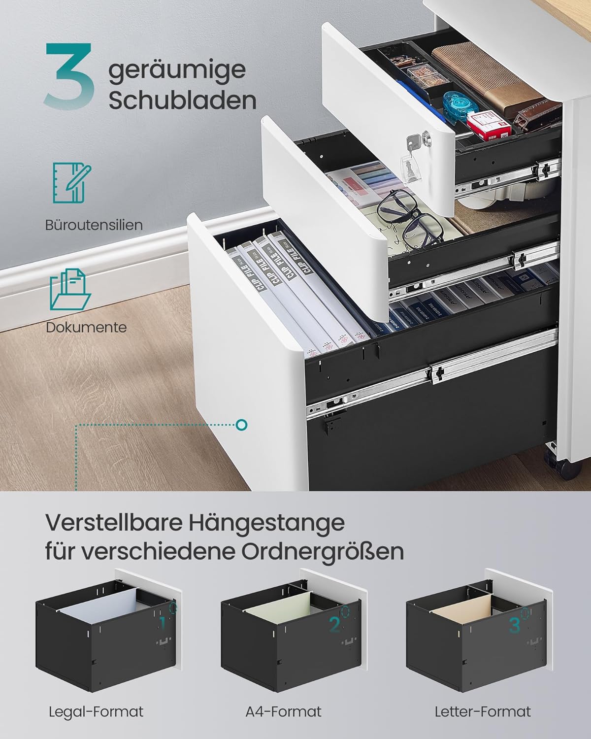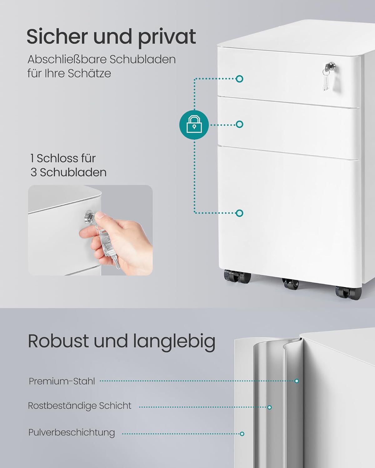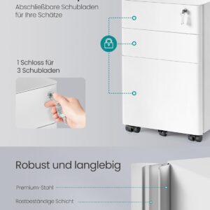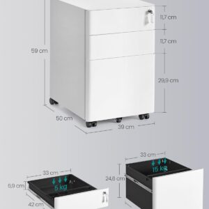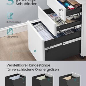- 5 praktische Universalräder: Der Aktenschrank ist mit 5 Rollen ausgestattet, 2 mit Bremsen, wodurch der Tisch mobil, aber auch standfest sein kann. Die fünfte Rolle an der Schublade unten sorgt für mehr Stabilität