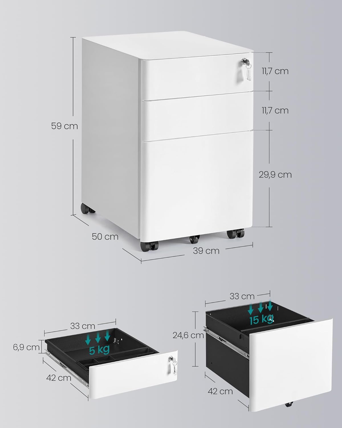 - Robust & sicher: Der Schrank aus hochwertigem Stahl besticht durch seine Robustheit und gute Belastbarkeit – jede kleine Schublade trägt bis zu 5 kg, die große bis zu 15 kg; alle Schubladen lassen sich mit einem Schloss abschließen