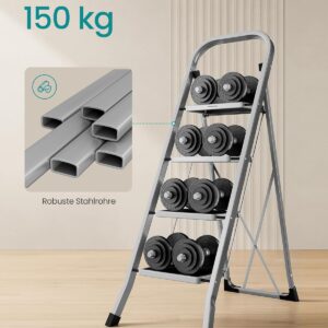 Die 4-stufige Trittleiter von SONGMICS wiegt 7,6 kg. Dank des integrierten Griffs lässt sich die Leiter trotz ihrer stabilen Bauweise sehr praktisch und einfach transportieren.