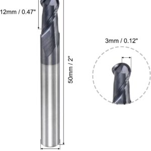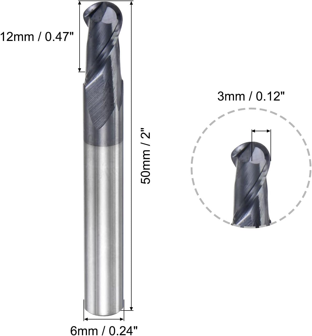 Der Fräser besitzt einen Schneiddurchmesser von 6 mm bei einem Schaftdurchmesser von ebenfalls 6 mm. Die Schneidenlänge beträgt 12 mm bei einer Gesamtlänge von 50 mm. Der Schneidradius am Kopf des Werkzeugs beläuft sich auf genau 3 mm.