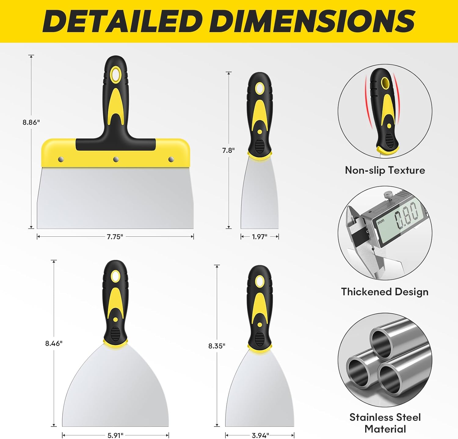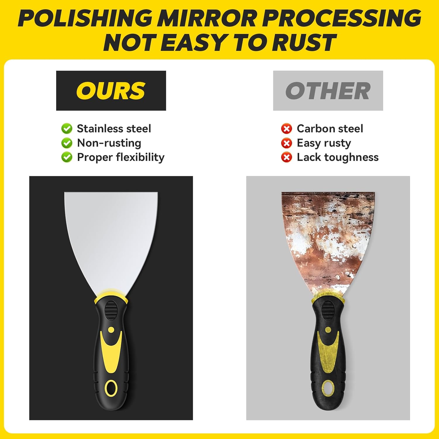 - Korrosionsbeständiger Edelstahl: Die Klingen aus 3CR13-Stahl sind hochglanzpoliert, rosten nicht und lassen sich nach dem Einsatz mit Spachtelmasse oder Kleister mühelos reinigen.
