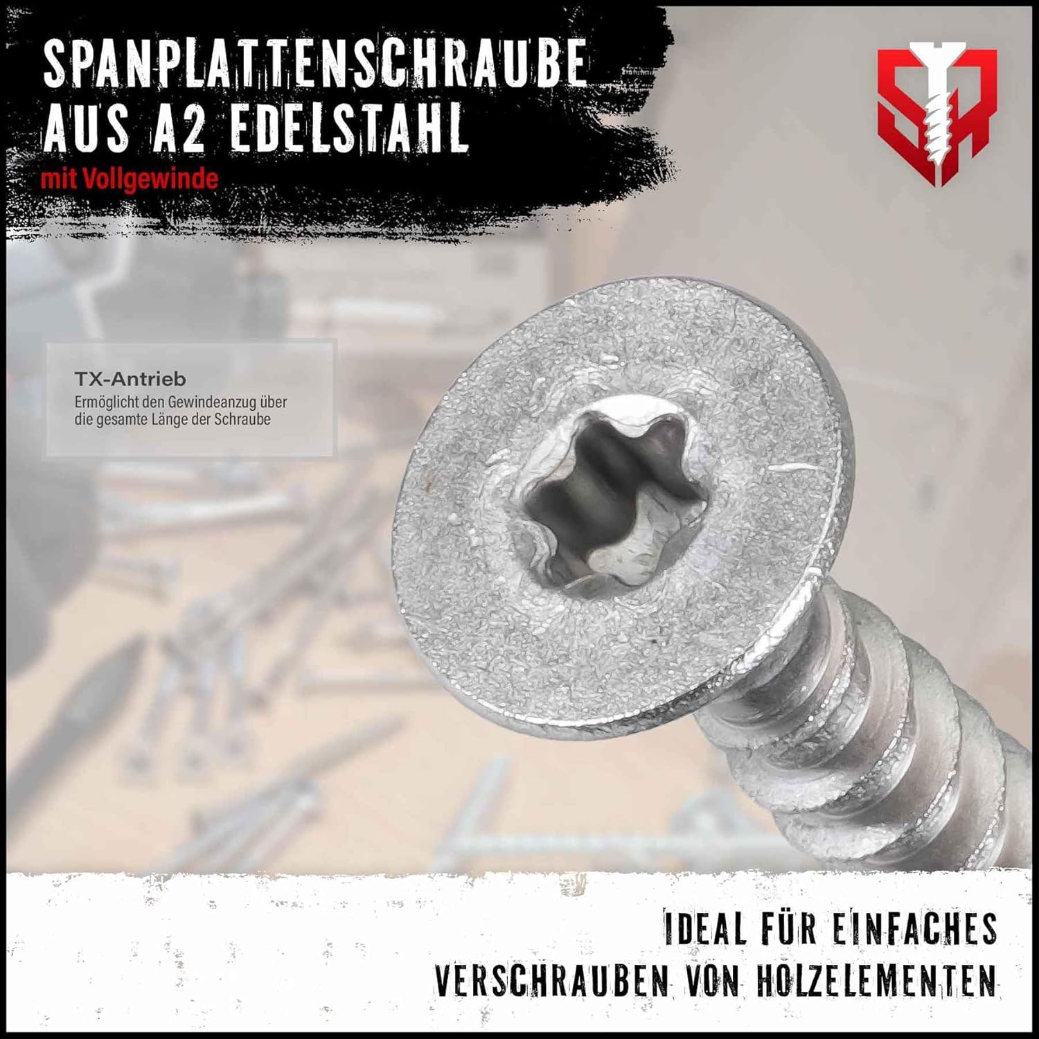 Spanplattenschrauben Edelstahl A2 – 4,5×100 mm, 100 Stück mit Vollgewinde, Torx, Senkkopf, ETA Zulassung, Edelstahlschrauben TX20