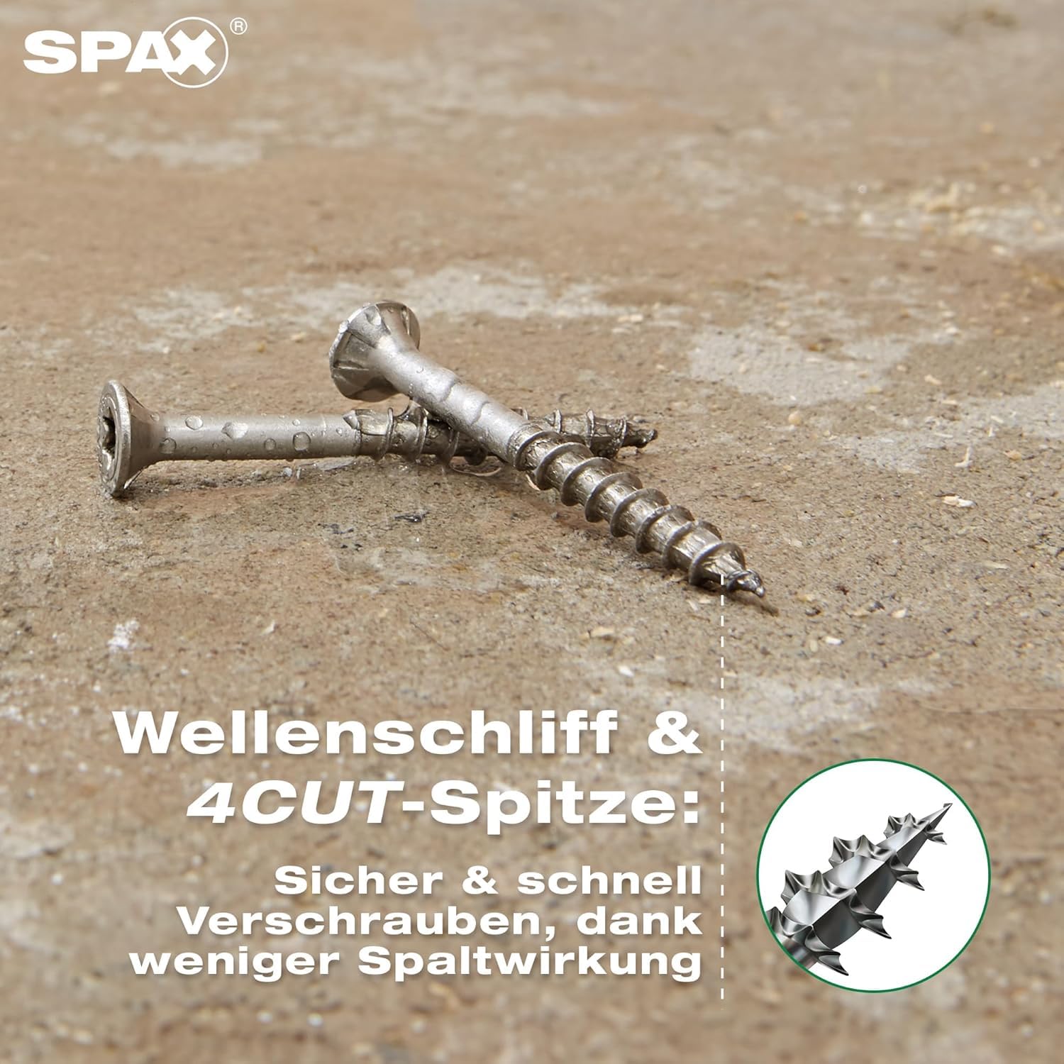 - 4CUT-Spitze: Sie durchdringt das Holz präzise, reduziert die Spaltwirkung massiv und macht das Vorbohren in den meisten Fällen überflüssig.