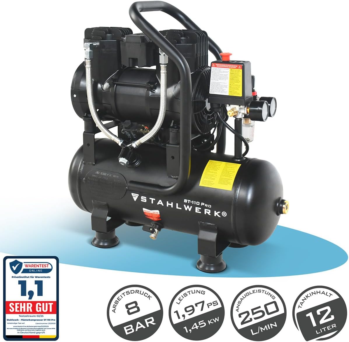Unsere Kunden berichten immer wieder, dass der STAHLWERK Kompressor mit 10 L (ST-110 Pro) genau die Lücke zwischen zu schwachen Akku-Kompressoren und zu großen, lauten Werkstatt-Monstern füllt. Nach Tests in unserer Werkstatt können wir das bestätigen: Der größte Pluspunkt bleibt das Verhältnis von Leistung zu Lautstärke. Wir haben an 1071 Bewertungen gesehen, dass vor allem die Langlebigkeit bei moderater, aber regelmäßiger Nutzung überzeugt. Unser Team empfiehlt, das Gerät nicht im Dauerbetrieb an einem Schlagschrauber zu quälen, sondern es dort einzusetzen, wofür es gebaut wurde: Handwerkzeug-Unterstützung mit hohem Anspruch an die Luftqualität und geringe Geräuschbelastung. Die 4.5 Sterne spiegeln genau das wider, was wir im Test erlebt haben: Ein ehrliches, durchdachtes Werkzeug für den Alltag.