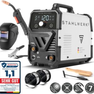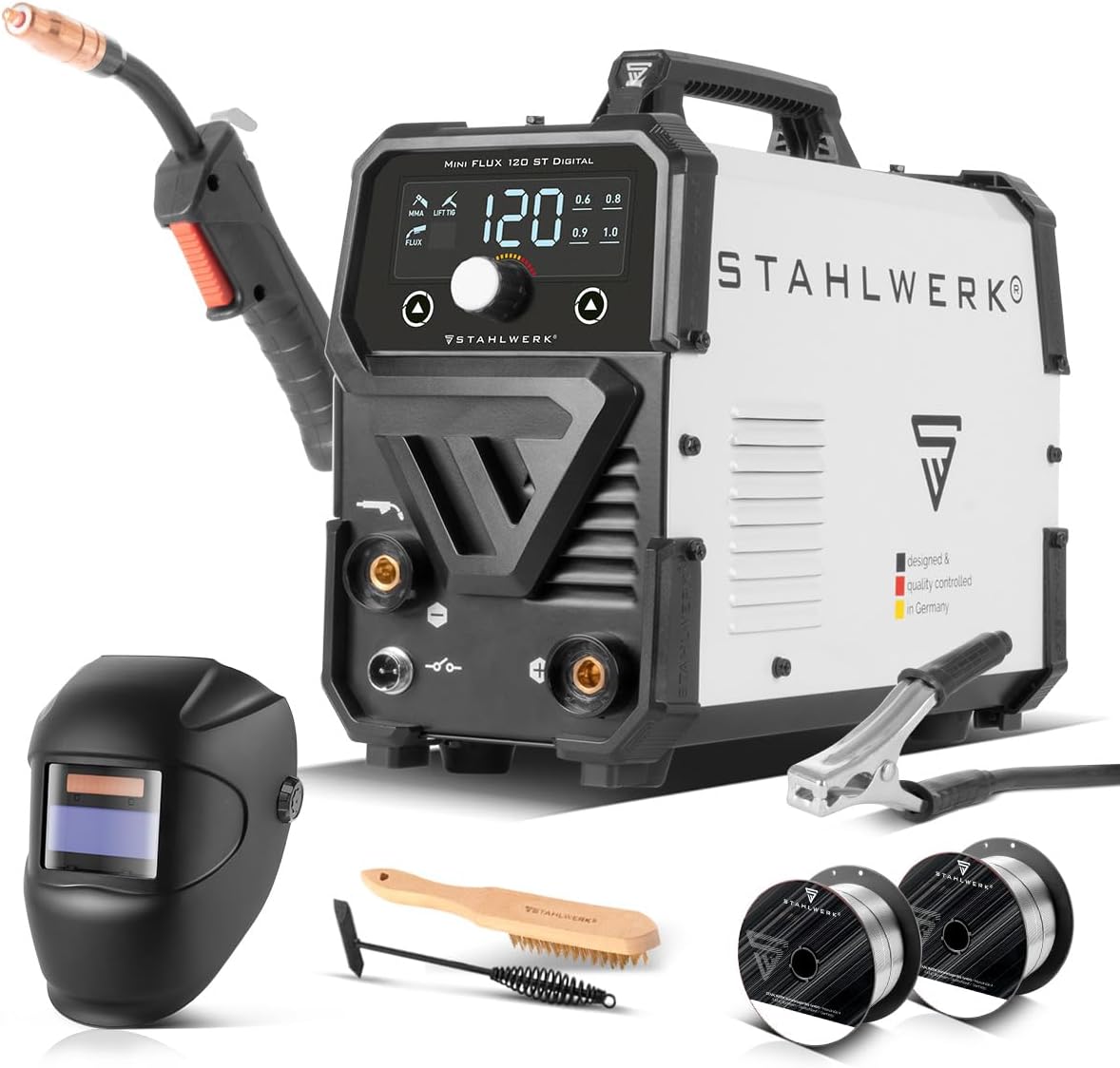 STAHLWERK Schweißgerät Mini FLUX 120 ST Digital – Vollausstattung – Fülldrahtschweißen (FLUX) ohne Schutzgas bis 120 A, synergischer Drahtvorschub, LED-Licht, Lift-TIG- & MMA-Funktion (E-Hand/ARC)STAHLWERK Schweißgerät Mini FLUX 120 ST Digital – Vollausstattung – Fülldrahtschweißen (FLUX) ohne Schutzgas bis 120 A, synergischer Drahtvorschub, LED-Licht, Lift-TIG- & MMA-Funktion (E-Hand/ARC)
