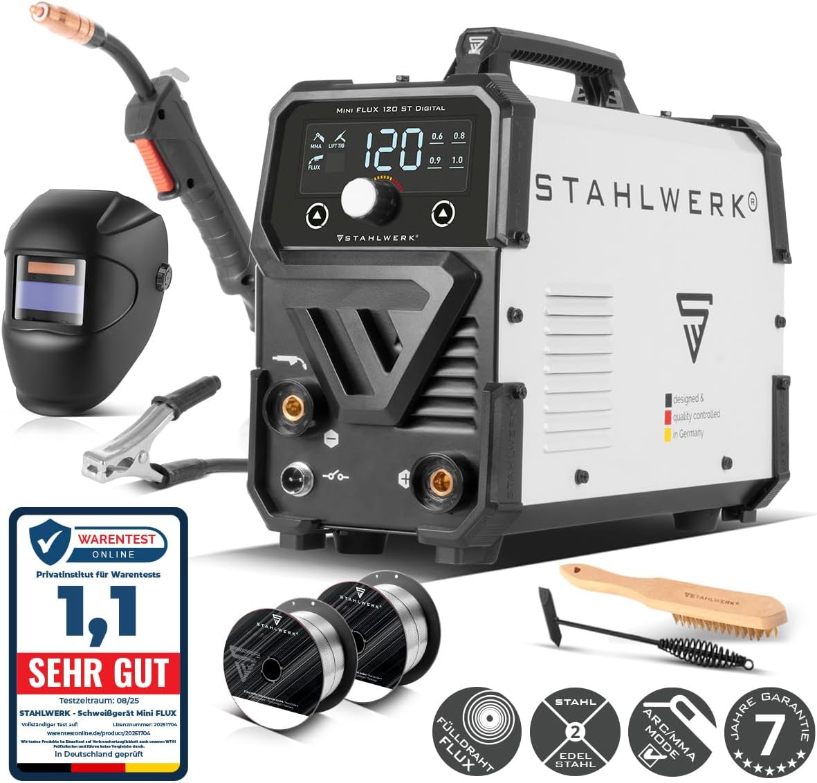 STAHLWERK Schweißgerät Mini FLUX 120 ST Digital – Vollausstattung – Fülldrahtschweißen (FLUX) ohne Schutzgas bis 120 A, synergischer Drahtvorschub, LED-Licht, Lift-TIG- & MMA-Funktion (E-Hand/ARC)