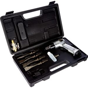 • MeisselhammDRUCKLUFTHAMMER-SET – Das Set besteht aus einem pneumatischen Meißelhammer mit 2 Rückschlagfedern, 4 Meißeln, 2 männlichen Schnellkupplungen (ARO) und 1 Mini-Öl-Zusatz.er Set
