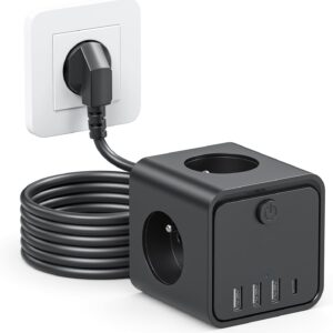 Die Bezeichnung 7-in-1 gibt an, dass der Steckdosenwürfel über insgesamt sieben Anschlüsse verfügt. Dazu gehören 3 AC-Steckdosen, 3 USB-A-Ports sowie 1 USB-C-Anschluss, um mehrere Geräte gleichzeitig zu laden. Mit einer Bewertung von 4,5 Sternen bietet das Produkt eine vielseitige Anschlussmöglichkeit für verschiedene elektronische Kleingeräte.