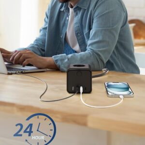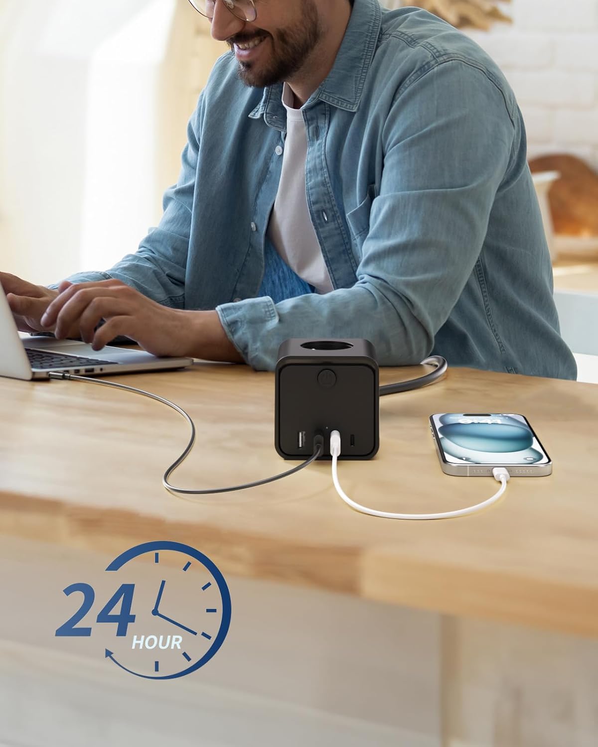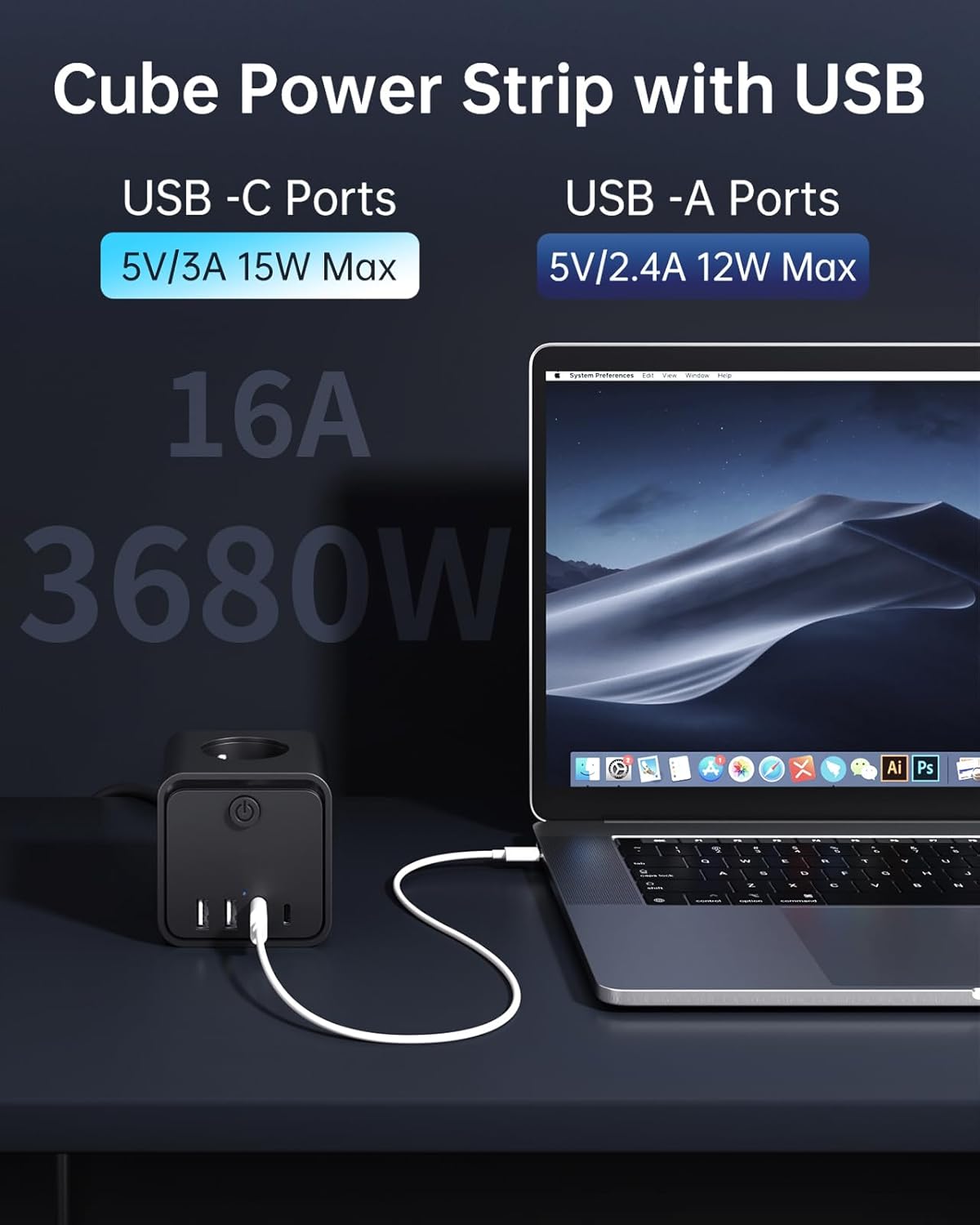 Die drei USB-A-Anschlüsse können jeweils einen maximalen Strom von bis zu 2,4 A liefern. Der USB-C-Anschluss bietet eine Leistung von 5 V / 3 A. Dies ermöglicht ein effizientes Laden Ihrer mobilen Geräte über den kompakten Würfel.