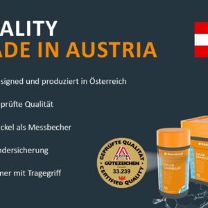 - Sicherheit: Trocken und kühl lagern. Behälter nach Gebrauch immer fest verschließen, um Feuchtigkeitszutritt zu verhindern.