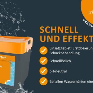 - Sofortige Wirkung: Das Chlorgranulat löst sich blitzschnell auf, was besonders bei der Schockbehandlung zum schnellen Erreichen notwendiger Chlorwerte führt.