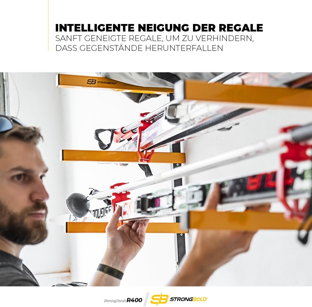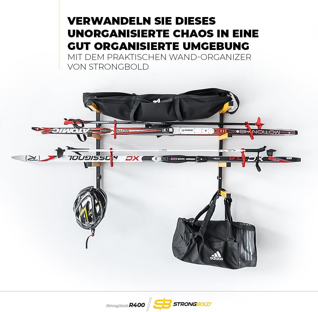 Ja, das StrongRack R400 ist ideal als Wandhalterung für Sportausrüstung wie Snowboards oder Skier geeignet. Dank der stabilen Stahlkonstruktion der vier Ablagen bietet es die nötige Sicherheit und Stabilität, um verschiedene Ausrüstungsgegenstände vertikal und platzsparend zu organisieren.