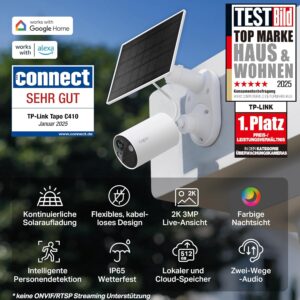 Das Tapo C410 KIT Solar Überwachungskamera Aussen Akku ist die ideale Lösung für sicherheitsbewusste Handwerker, Werkstattbesitzer und Eigenheimbesitzer, die eine autarke Überwachungslösung suchen. Mit der Kombination aus 2K-Auflösung und solarer Energieversorgung schützt du dein Material und deine Räumlichkeiten effektiv vor unbefugtem Zugriff. Dieses System ist perfekt für Profis geeignet, die eine schnelle, kabellose Installation ohne aufwendige Elektroarbeiten bevorzugen.