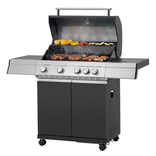 Tarrington House BBQ Gas-Grill PAXTON, 4-Brenner-Gasgrill mit Seitenbrenner, schwarz, Warmhaltegitter, 11kg Gasflasche für Outdoor, Balkon, Camping
