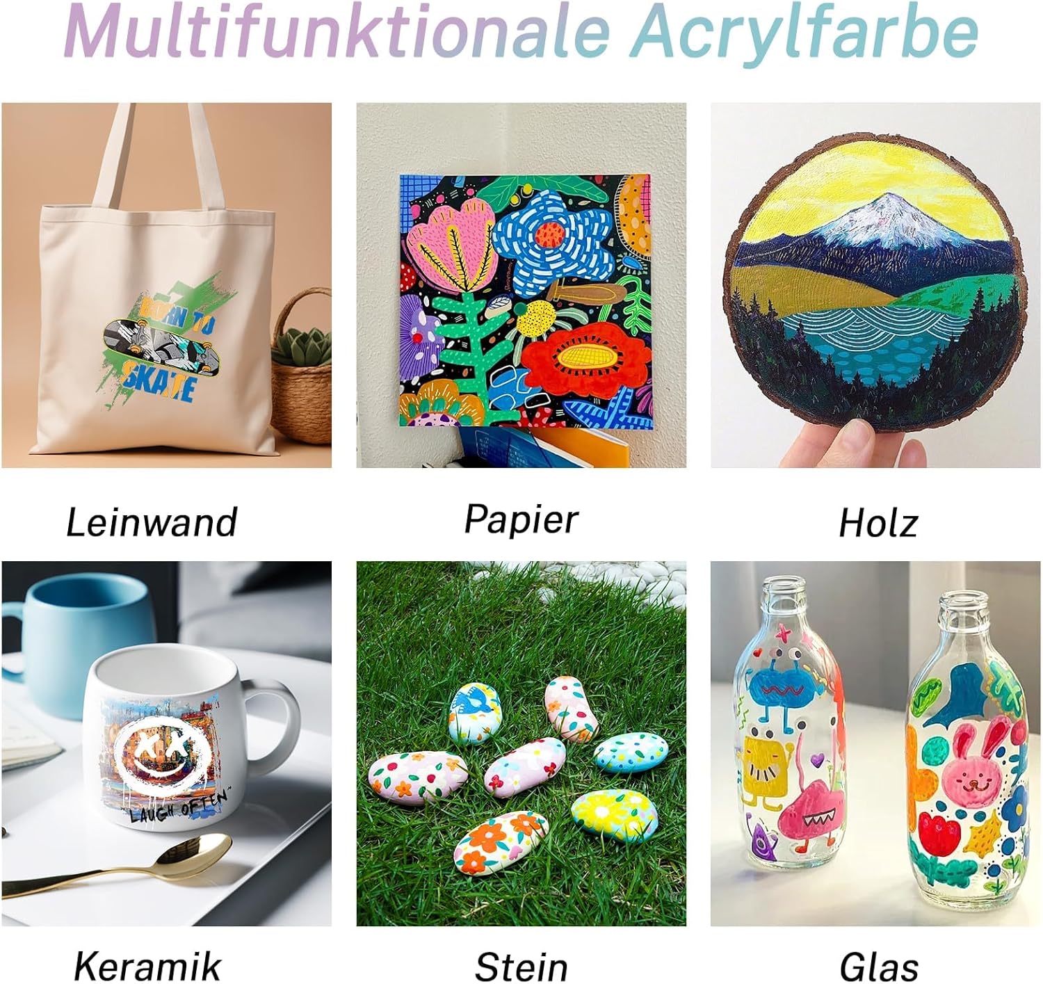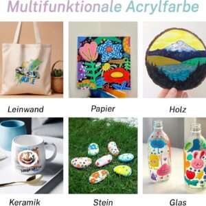 Die Acrylfarben sind vielseitig einsetzbar und haften auf einer Vielzahl von gängigen Bastelmaterialien wie Leinwand, Papier oder Holz. Da keine spezifischen technischen Daten vorliegen, empfiehlt sich vorab ein kleiner Test auf dem gewünschten Maluntergrund.